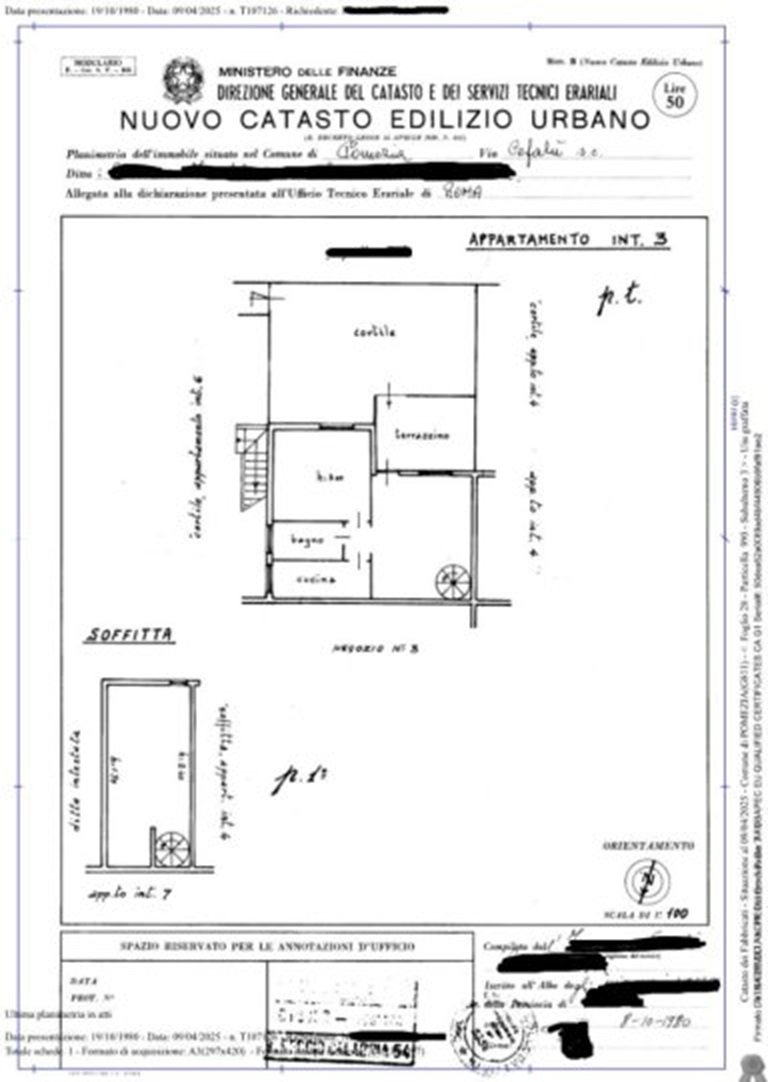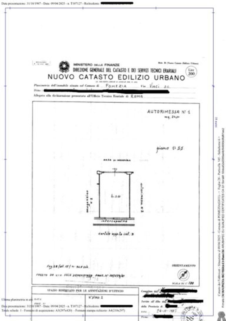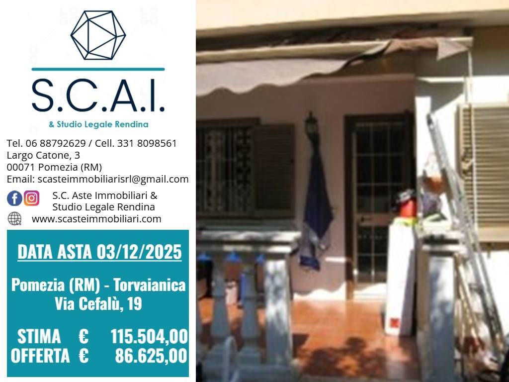 Piena proprietà di “appartamento ubicato a Pomezia (RM) - Via Cefalù, 19 e Via Vinci n.6 interno 3, piano T-1. Appartamento con annessa area adibita a corte e soffitta quest'ultima collegata con l'appartamento con scala a chiocciola posta il piano primo sito in Via Cefalù n.19; con annesso Box al piano S/1 con ingresso da Via Vinci n. 6. Il tutto sito nel Comune di Pomezia località Torvaianica. L'appartamento risulta così suddiviso: giardino di mq. 31,50, terrazzino di mq. 6,90, pranzo soggiorno di mq 15,70, cucina di mq 4,75, bagno di mq. 3,30, letto di mq 10,44 dal pranzo soggiorno insiste scala a chiocciola per accedere al piano primo dove insiste soffitta di mq. 13,95 con H media di ml. 2,05. All'incrocio con Via Cefalù si trova Via Vinci ove insiste il Box di mq. 23,00. Il tutto per una Superficie Utile Abitabile di mq. 39,05 ed una Superficie non Residenziale di mq. 52,35 ed un Box di mq. 23,00 il tutto per una Superficie ragguagliata di mq 72,19.