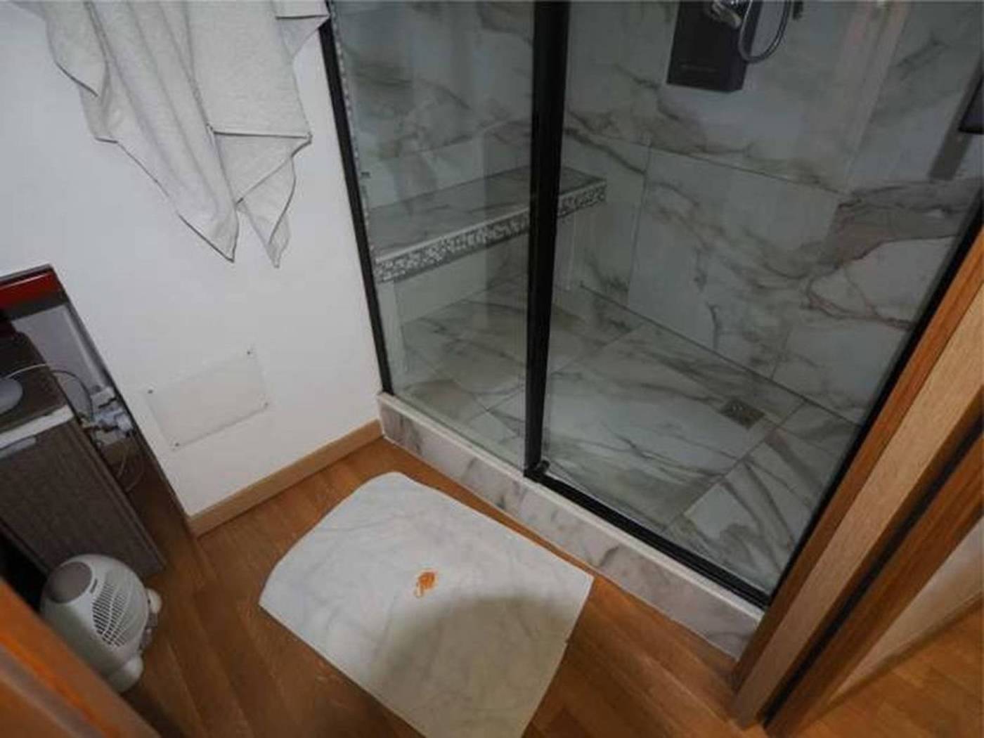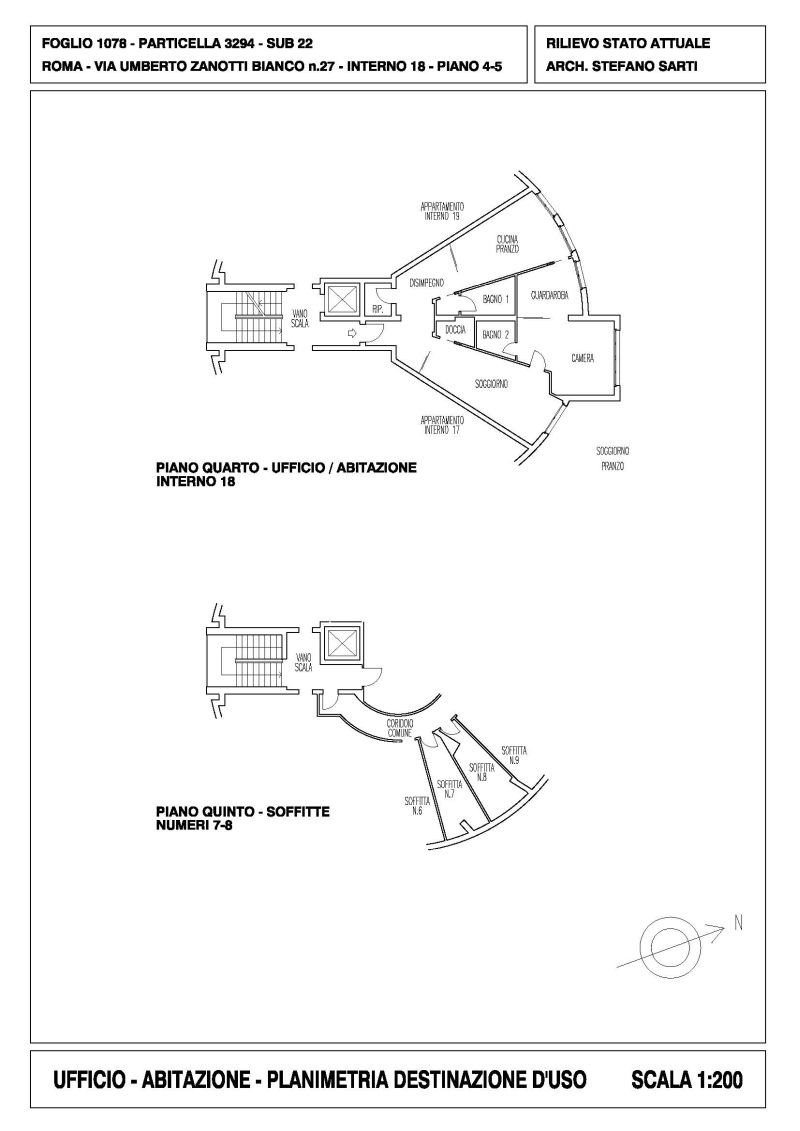 - Ufficio (ad oggi uso abitazione): L'ufficio (ad oggi uso abitazione) visitato, posto al piano quarto del fabbricato, interno n.18, si compone di: disimpegno, soggiorno, cucina-pranzo, camera, guardaroba, ripostiglio, locale doccia e due bagni. Non sono presenti balconi.