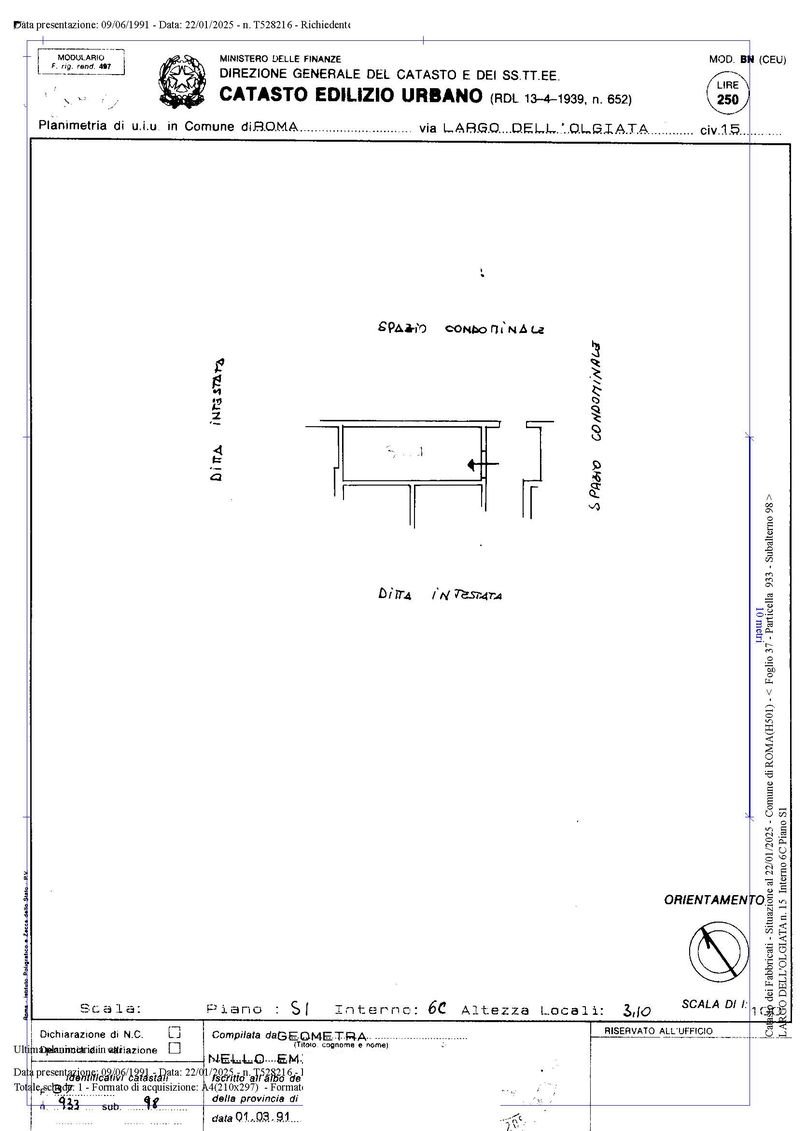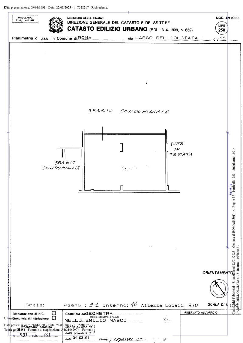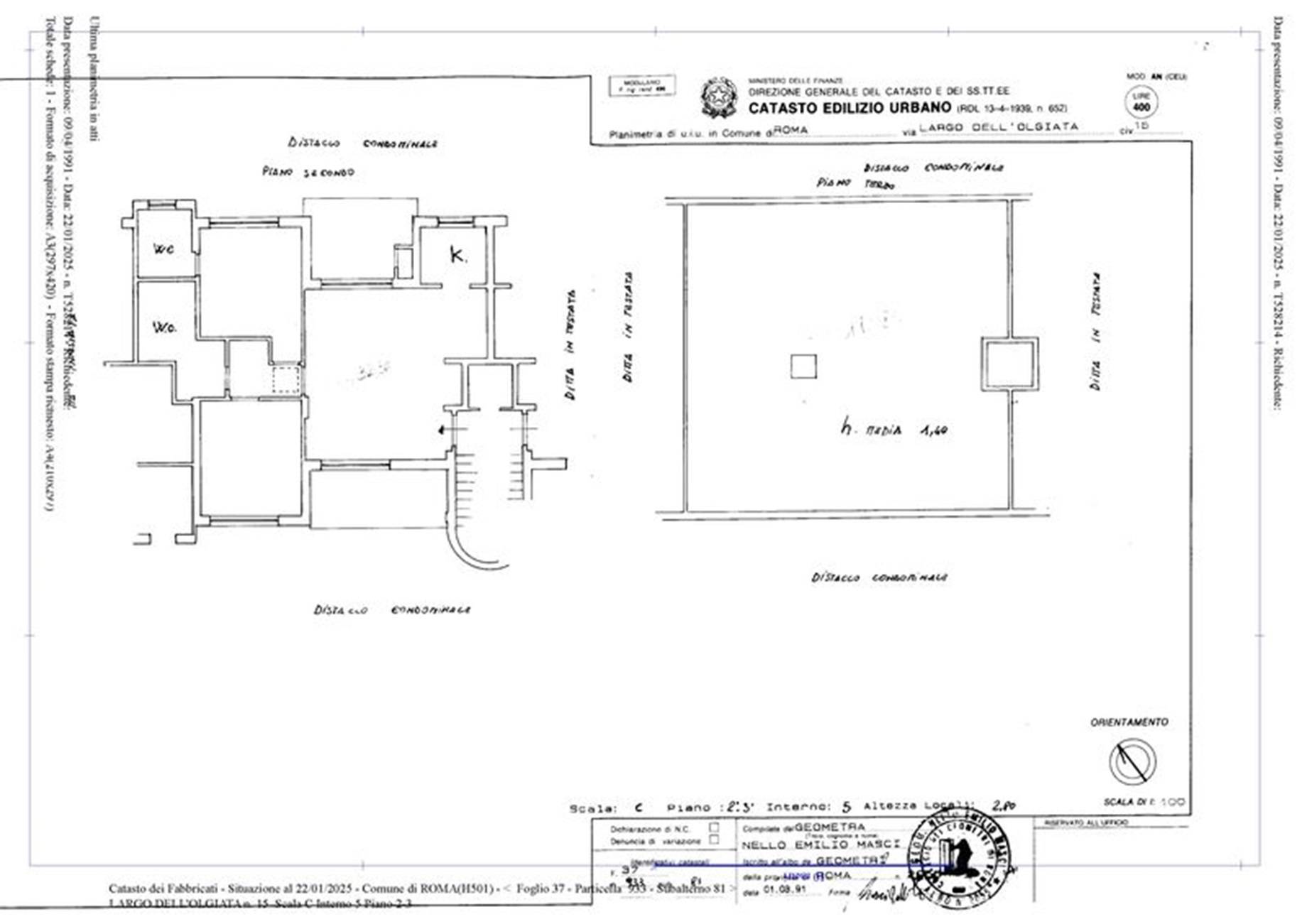 Intera proprietà dell'appartamento sito in Roma, Largo dell'Olgiata n. 15, edificio Isola 19 – C/43, scala C, interno 5, piano 2-3, composto da soggiorno–pranzo, angolo cottura, ripostiglio, disimpegno, due camere, due bagni e due balconi, con annessa soffitta, superficie lorda dell'appartamento mq 92,30 esclusi i balconi, superficie lorda della soffitta mq 59,60, con annessi una cantina al piano S1 distinta con l'int. 6 C, con superficie lorda di 6,20 mq, ed un box auto al piano S1 distinto con l'int. 10, con superficie lorda di 34,80 mq. Il fabbricato che ricomprende le unità immobiliari in esame è sito nel Comune di Roma, fascia suburbana, settore nord-ovest della città, esternamente al Grande Raccordo Anulare, frazione “Olgiata”. Trattasi di una vasta area costituita a comprensorio delimitato da recinzione e monitorato 24 ore su 24 da un servizio di vigilanza che ne controlla l'accesso e l'uscita. Il comprensorio è caratterizzato da una grande ampiezza di aree verdi ben curate e da numerose ville signorili. Al comprensorio si accede attraverso l'ingresso che avviene da Largo dell'Olgiata n.15, in prossimità della via Cassia, subito dopo la frazione di “Isola Farnese”. Attraverso una viabilità interna al comprensorio, in direzione dell'isola 19, strada C, si raggiunge il fabbricato di cui fanno parte gli immobili in esame. Allo stabile che ricomprende gli immobili in oggetto (edificio C43) si accede tramite ampio e curato cortile comune ad altri tre fabbricati (C41-C42-C44) in parte sistemato a verde ed in parte pavimentato