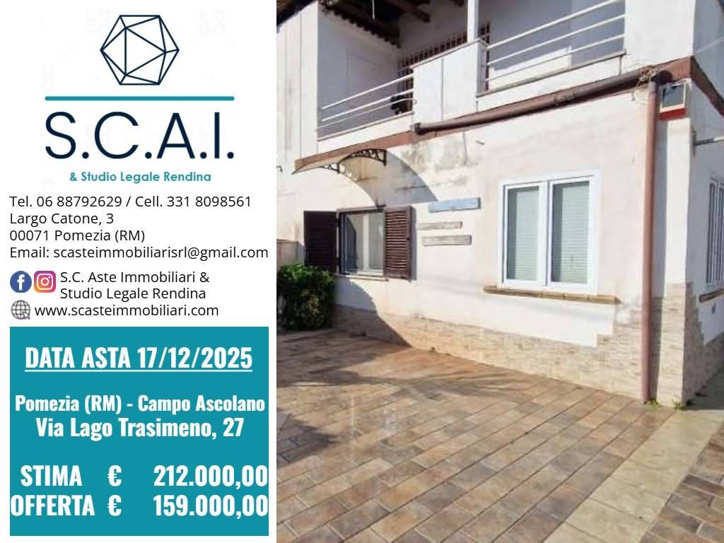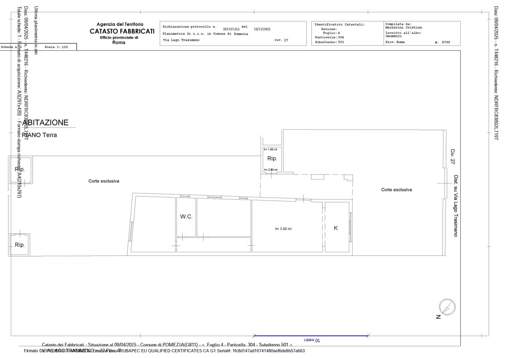 Piena proprietà di appartamento con giardino e pertinenze ubicato a Pomezia (RM) - Via Lago Trasimeno 27, piano T composto da due camere, soggiorno, cucinino, Bagno, 3 Ripostigli, Portico e corte pertinenziale. La S.U.A. della parte abitativa è di mq. 96,47 i ripostigli di mq. 10,15 Portico di mq. 13,80, area a Giardino mq. 233,50.