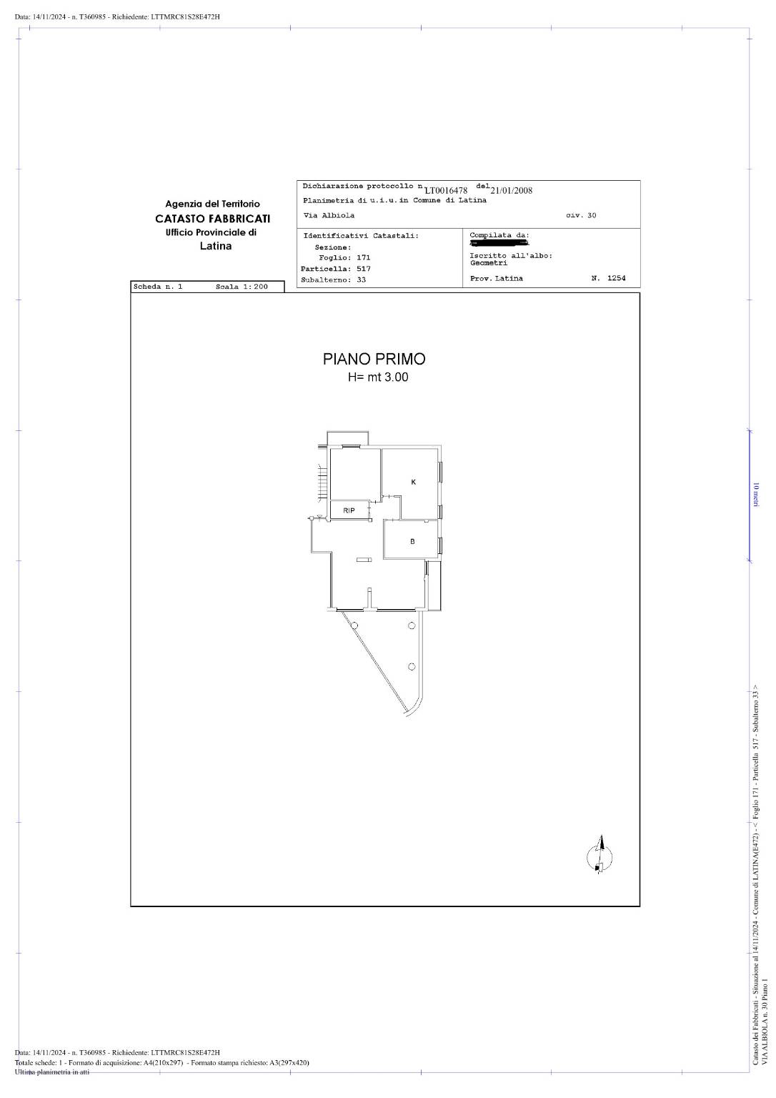 Piena ed intera proprietà di abitazione sita in Latina (LT), Via Albiola n. 30 al piano primo di un fabbricato per civile abitazione e negozi composta da una zona giorno caratterizzata da un'open-space con doppio affaccio, uno sulla terrazza posta a Sud e l'altro sul balcone più piccolo posto a Est, il tutto adibito a pranzo soggiorno e annesso angolo cottura e da una zona notte composta da due camere da letto, due bagni, di cui uno a servizio esclusivo della camera da letto matrimoniale e un ripostiglio; la camera da letto singola è dotata di un balconcino orientato a nord con affaccio sulla corte del fabbricato.