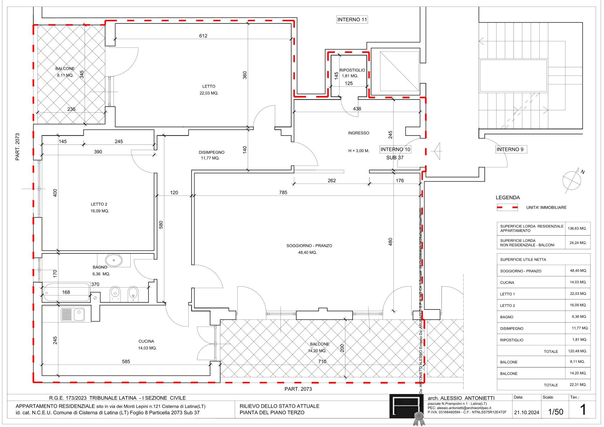 Appartamento situato al piano terzo, interno 10, facente parte del complesso immobiliare denominato “Residenza del Gallo” situato nella zona periferica del versante EST del Comune di Cisterna di Latina. L'unità immobiliare è composta da ingresso, soggiorno/pranzo, cucina, disimpegno, 2 camere da letto, bagno, ripostiglio e 2 balconi.