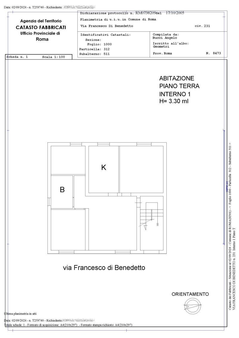 Quota pari a 1/1 del diritto di intera proprietà dell'immobile destinato ad abitazione ad uso civile sito in Roma alla via Francesco Di Benedetto n. 231, piano terra, int. 1, composto da soggiorno, cucina, tre camere e 1 bagno, oltre a corte pertinenziale posteriore.