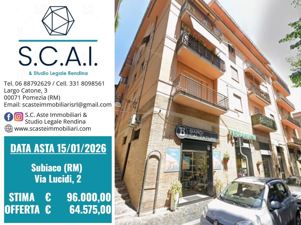Quota pari a 1/1 del diritto di piena proprietà su abitazione sita nel comune di Subiaco in Via Lucidi n. 2, ubicata al primo piano della scala “B”, distinta con il numero int. 2; l'appartamento, composto da un unico livello, si compone dei seguenti ambienti: ingresso/disimpegno, disimpegno, 2 camere, cucina, soggiorno, bagno e balcone.