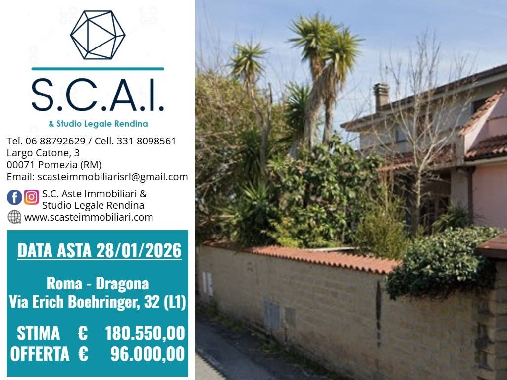 Quota pari a 1/1 diritto di proprietà sull'immobile destinato ad abitazione villetta sito in Roma alla via Erich Boehringer 32-34, interno 2, piano T-1: porzione di villetta quadrifamiliare composta da ampio giardino esterno con porticato, internamente al piano terra da soggiorno, cucina e bagno e al piano primo da 3 camere da letto e un bagno, oltre a balcone, per complessivi mq. 154,00 circa lordi, oltre mq. 176,20 circa lordi per aree scoperte.