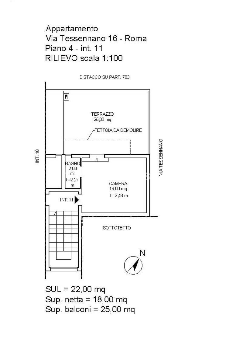 Quota pari a 1/1 del diritto di piena proprietà su monolocale sito in Roma, quartiere Tomba di Nerone-Grottarossa, Via Tessennano n. 16, piano 4, int. 11, composto da: un'unica camera con piccolo angolo cottura, un bagno, per complessivi mq. 22,00 oltre ad un ampio terrazzo di mq 25,00.