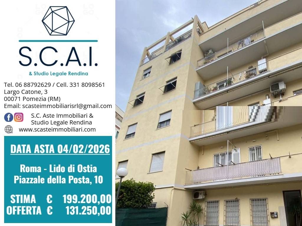 Quota pari a 100/100 del diritto di proprietà su appartamento sito in Roma, Ostia Lido, Piazzale della Posta n. 10, edificio C, scala B, interno 4, piano 1, composto da soggiorno, cucina, bagno, disimpegno, camera, cameretta e balcone, per complessivi mq 82 mq, oltre il balcone di 4 mq.