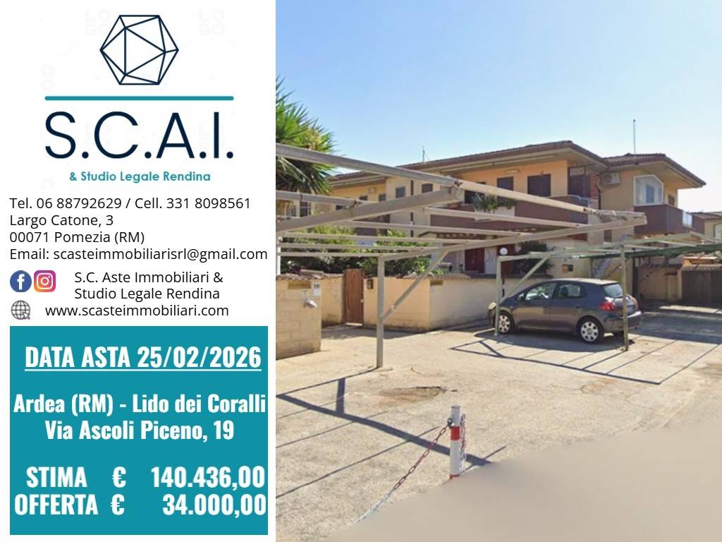 Appartamento ubicato a Ardea (RM) - via Ascoli Piceno, 19, edificio D, interno 2, piano T-S1 Trattasi di appartamento con ingresso indipendente, distinto con il n. 2 di interno, posto al piano terra (in realtà rialzato) di fabbricato elevato a due piani fuori terra, oltre interrato, facente parte di blocco denominato D di villini a schiera realizzati con struttura portante in c.a. e tamponature costituite da muratura finita ad intonaco tinteggiato. Risultano annessi a detta unità immobiliare anche corte di pertinenza esclusiva antistante la casa, locale cantina posto al piano seminterrato, al quale si accede tramite scala esterna dalla corte ed infine v'è posto auto scoperto, distinto con il n. 19, sito nell'area esterna adiacente all'immobile. L'ubicazione è nella zona periferica del comune di Ardea - denominata Marina di Ardea - dotata dei normali servizi di tipo generale e provvista di parcheggi.