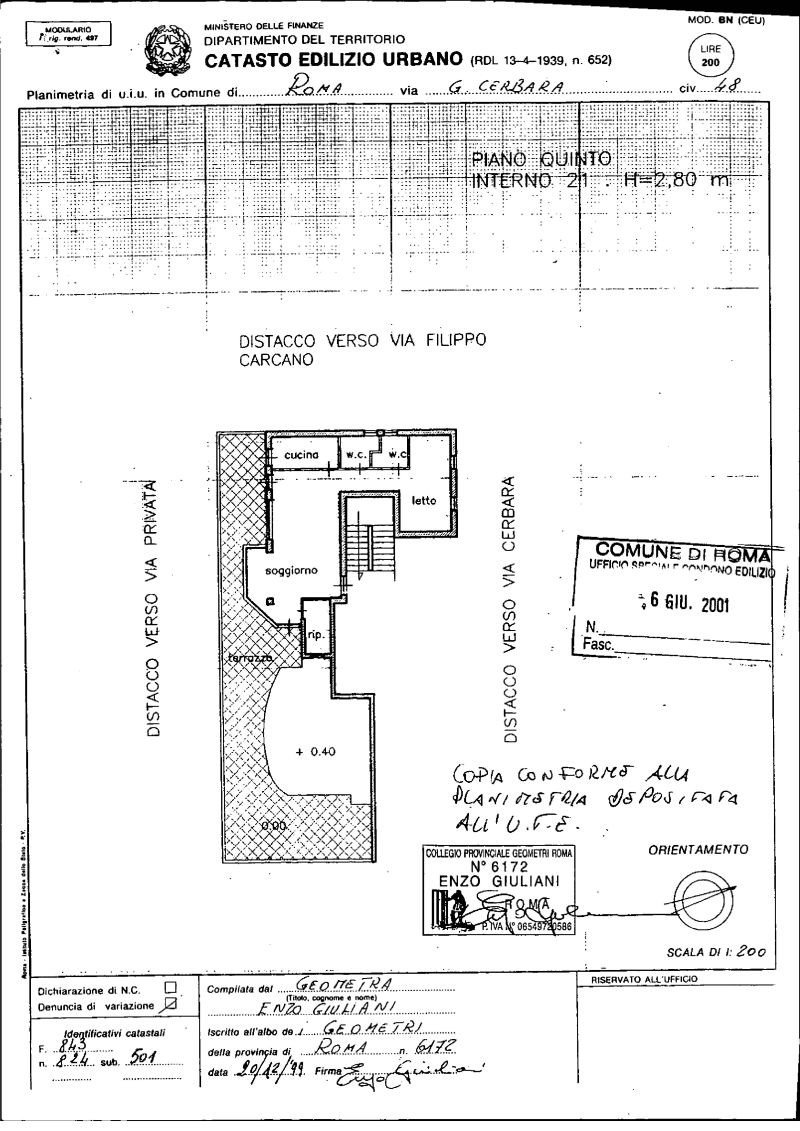 Piena ed intera proprietà, nel Comune di Roma (RM), Via Giuseppe Cerbara n. 48, su appartamento per civile abitazione posto al piano 5 (quinto), distinto con il numero interno 21, composto da soggiorno, camera da letto, due bagni, cucina, ripostiglio, due verande e terrazzo.