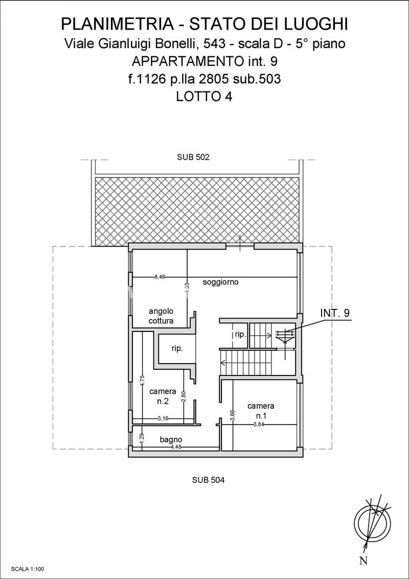 Quota pari a 1/1 del diritto di proprietà su appartamento di mq. 102 c.a. commerciali sito in Roma – Via Gianluigi Bonelli n. 543 scala D piano V int. 9 così composto: soggiorno con angolo cottura, disimpegno, due camere, un bagno, ripostiglio, un terrazzo box auto n. 24 di mq. 19 commerciali ubicato al piano S1. Il complesso residenziale è situato nel Comune di Roma, in Viale Gianluigi Bonelli nn. 543 (accesso pedonale) e 545 (accesso carrabile), nel quartiere Mezzocammino, Municipio IX, in un'area residenziale di recente urbanizzazione posta nella zona sud della città, all'esterno del Grande Raccordo Anulare. Il contesto è prevalentemente abitativo, ordinato e ben collegato alla viabilità principale, con presenza di servizi di quartiere e spazi verdi. Il complesso è inserito all'interno di un piano urbanistico convenzionato del Consorzio Unitario Torrino Mezzocammino ed è composto da edifici residenziali pluripiano realizzati con criteri edilizi moderni. I fabbricati si sviluppano su sei piani fuori terra, comprensivi del piano terra pilotis, oltre a piani interrati e seminterrati destinati a autorimesse e locali accessori.